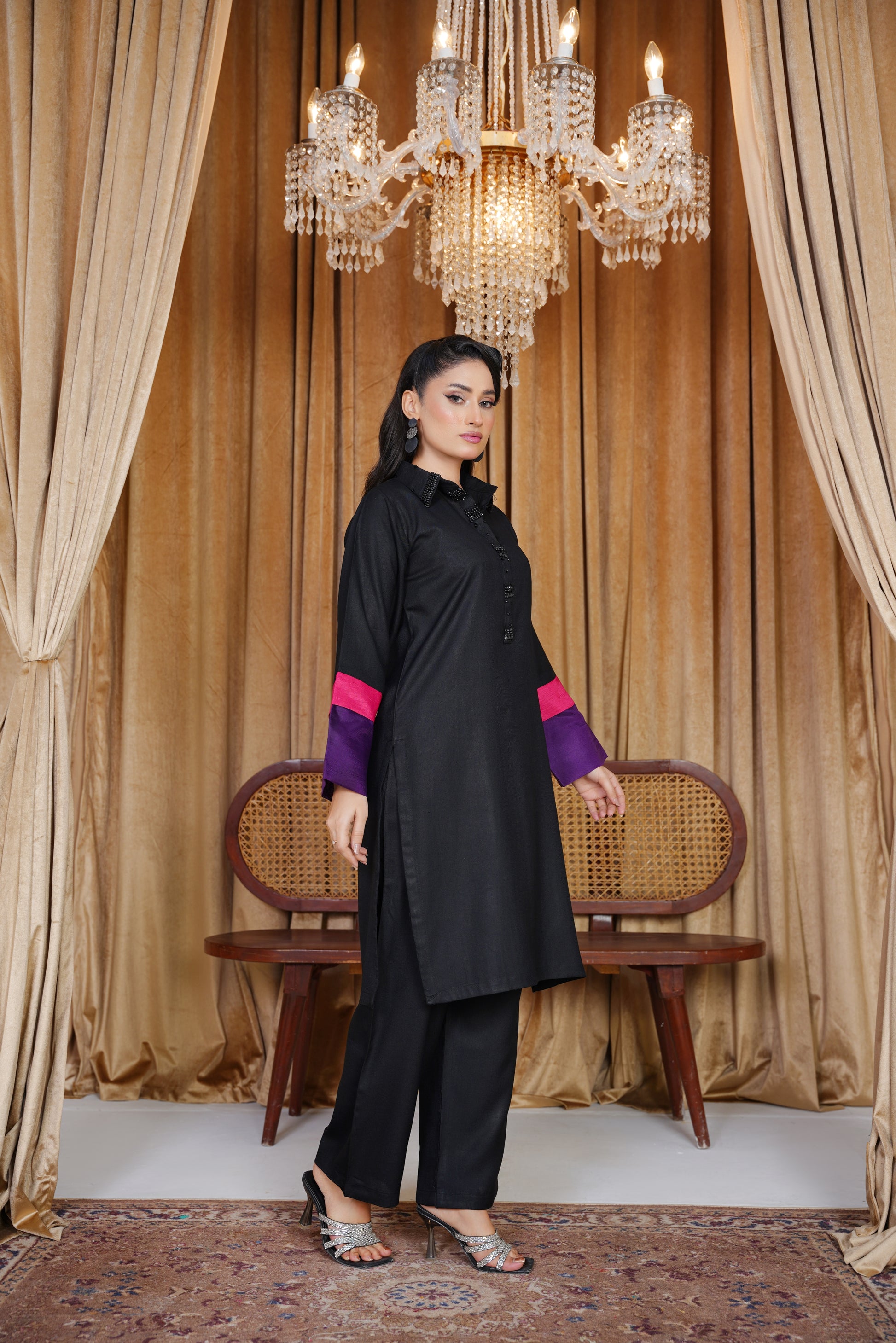 Black Opulence delivers timeless grace with its deep black palette enriched through handcrafted embellishments. Made from premium Dhanak fabric, this 2Pc Ready-to-Wear Suit features detailed stone and crystal work along the neckline and buttons. The classic silhouette, paired with a plain matching trouser, makes it a versatile winter staple. Whether worn to semi-formal evenings, intimate gatherings, or festive dinners, Black Opulence offers chic sophistication with effortless charm.