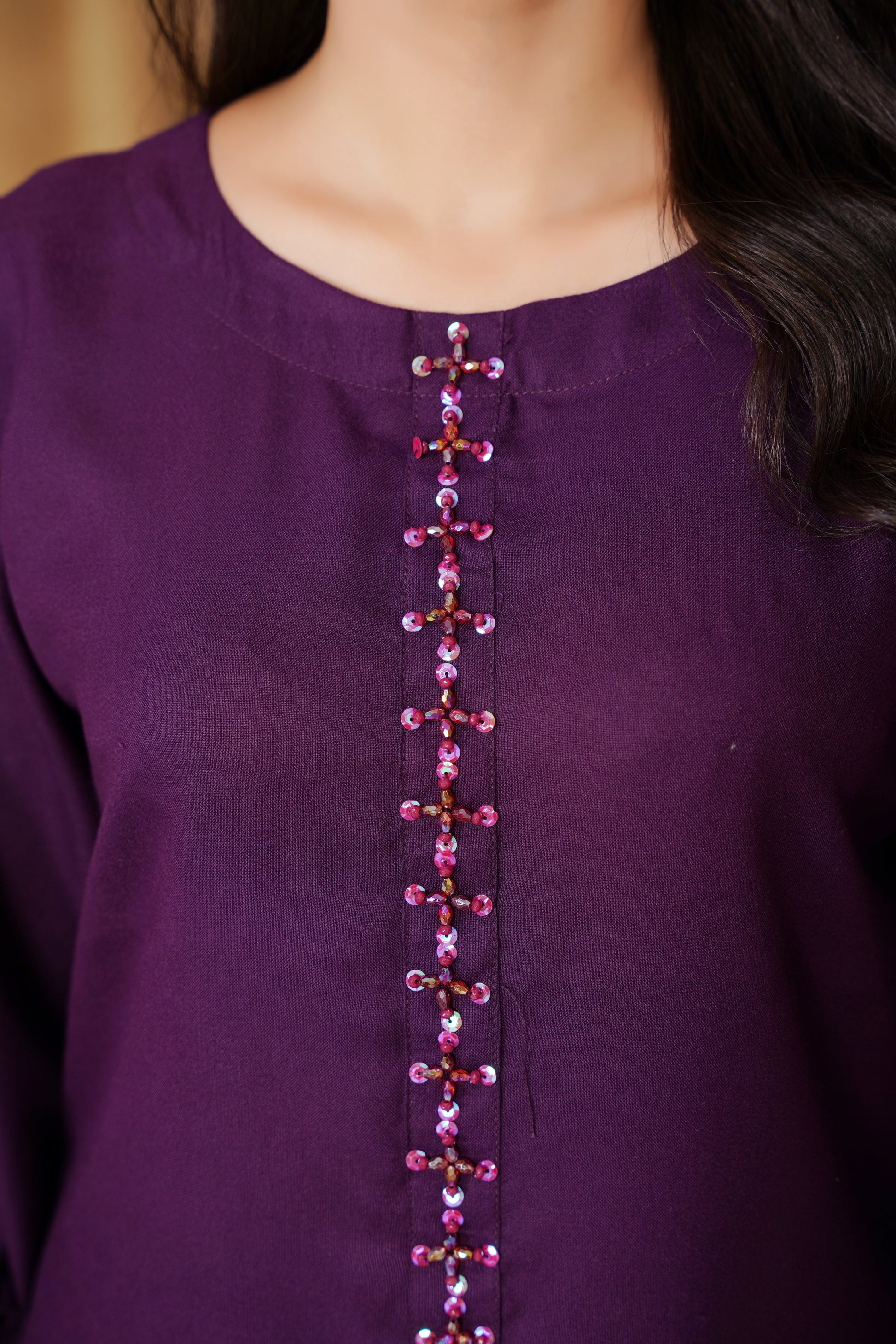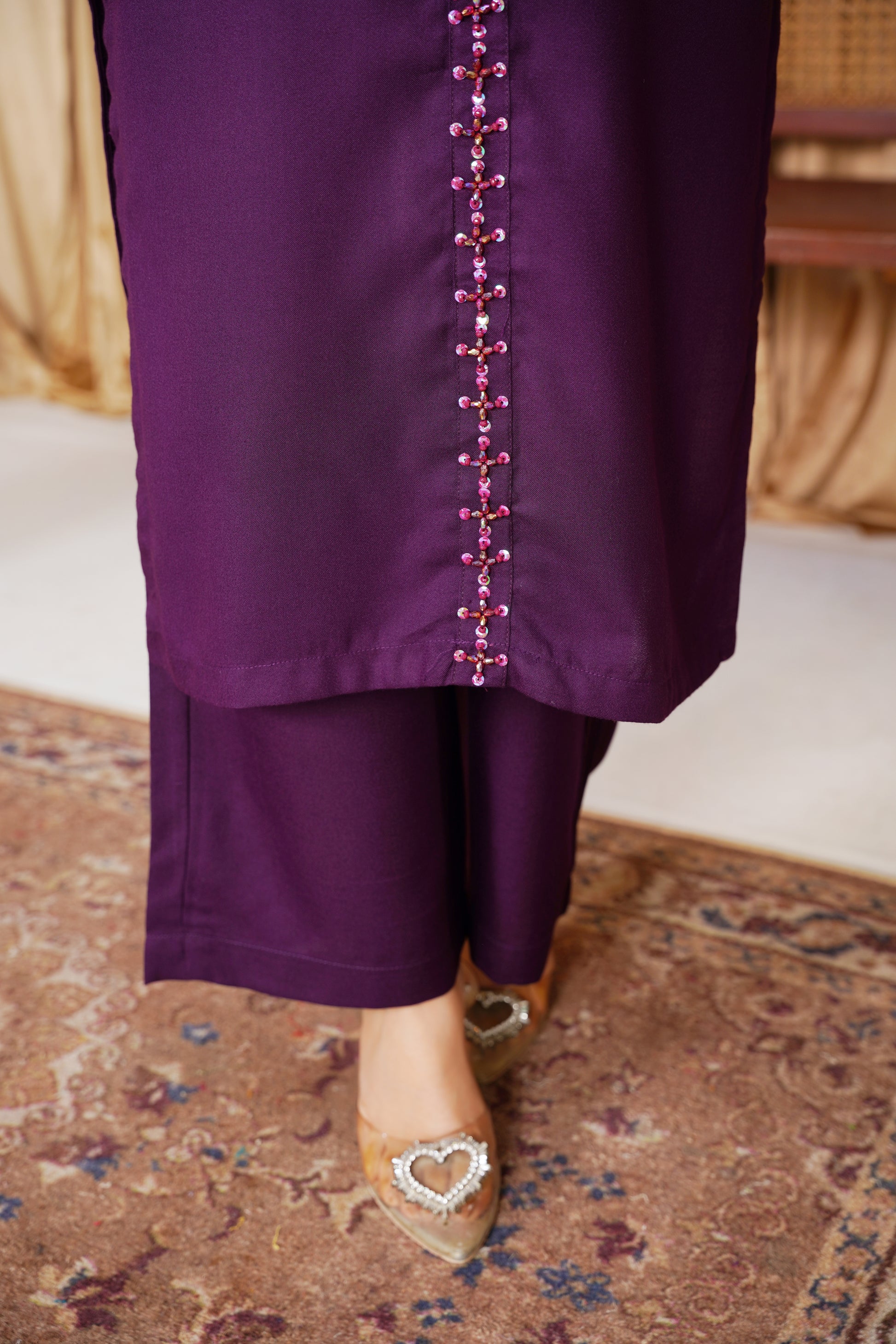 Mystic Purple blends graceful minimalism with handcrafted finesse. Made from premium Dhanak fabric, this 2Pc Ready-to-Wear Suit showcases stone and crystal handwork along the front panel and sleeve cuffs. Its deep purple tone paired with a plain matching trouser creates a refined winter ensemble. Perfect for semi-formal occasions, evening gatherings, and festive moments, Mystic Purple offers polished elegance with elevated comfort.
